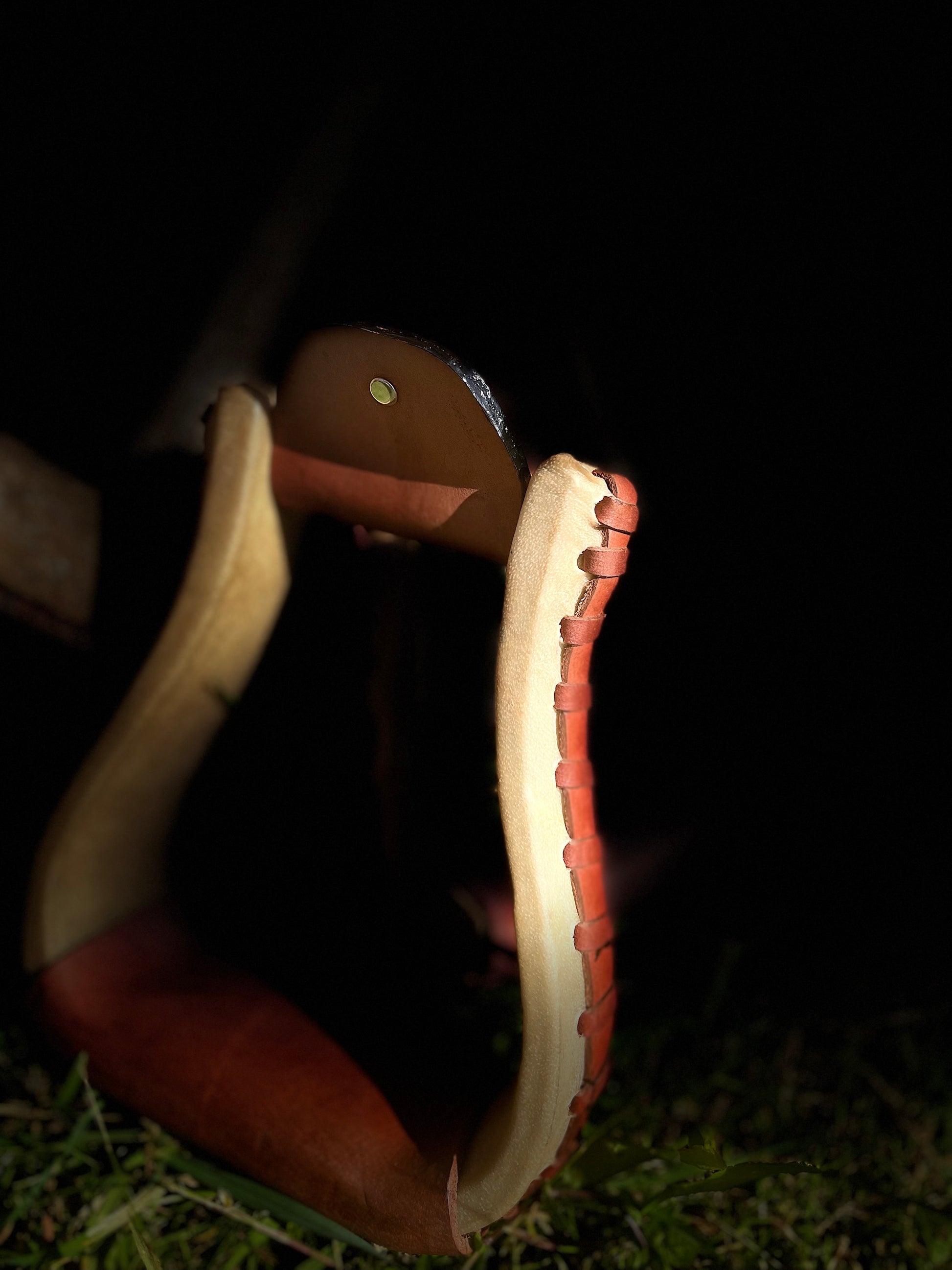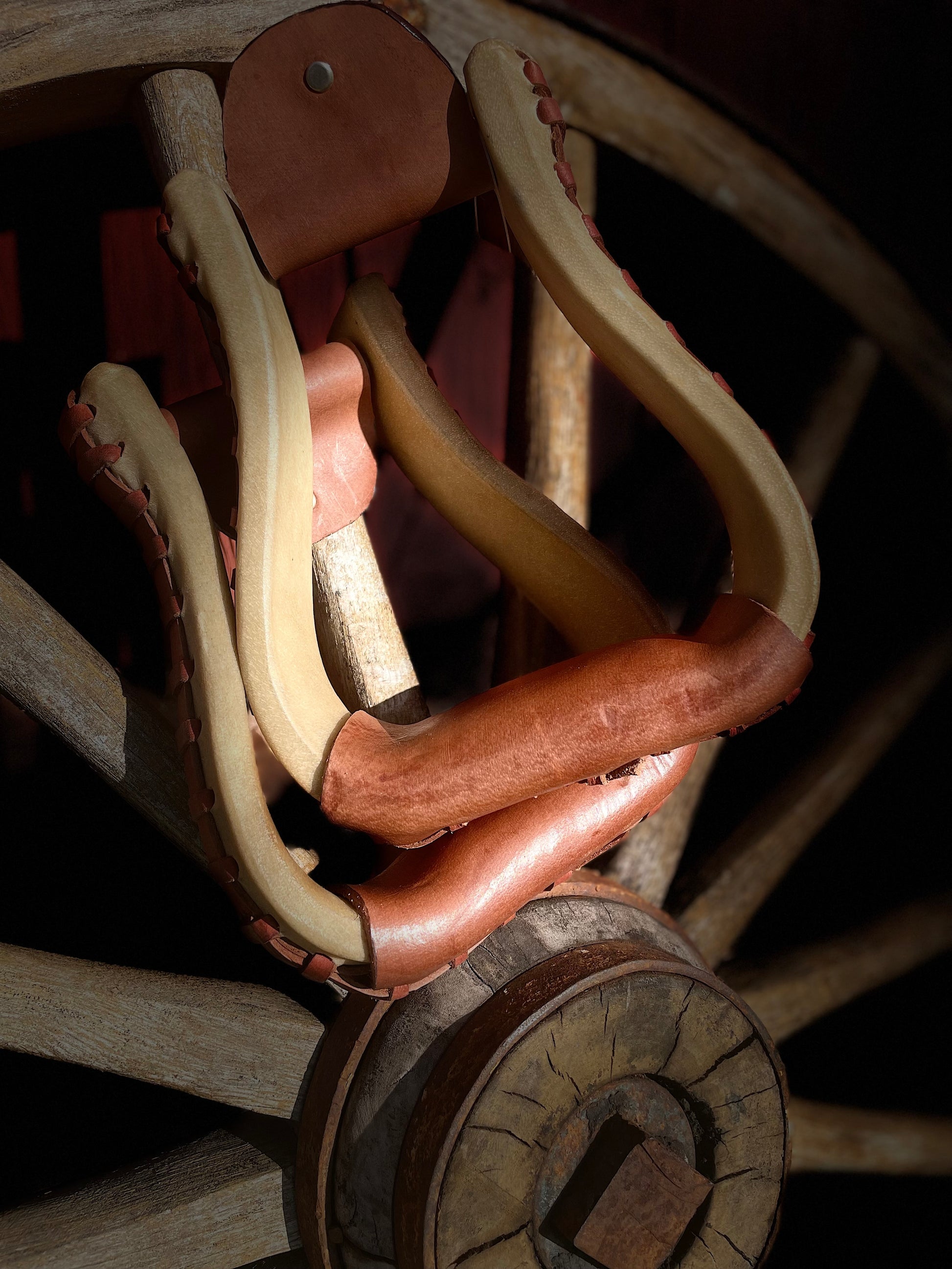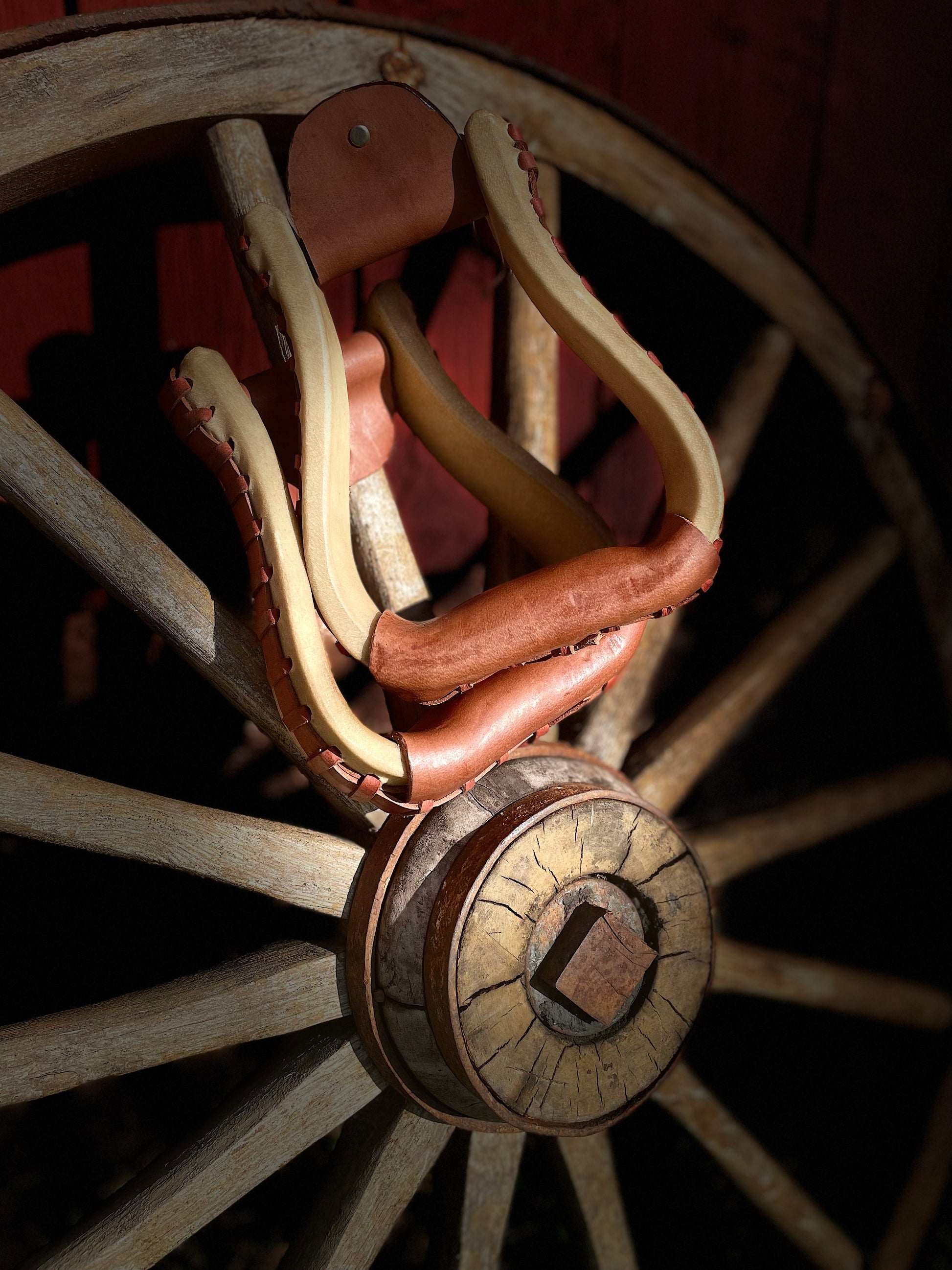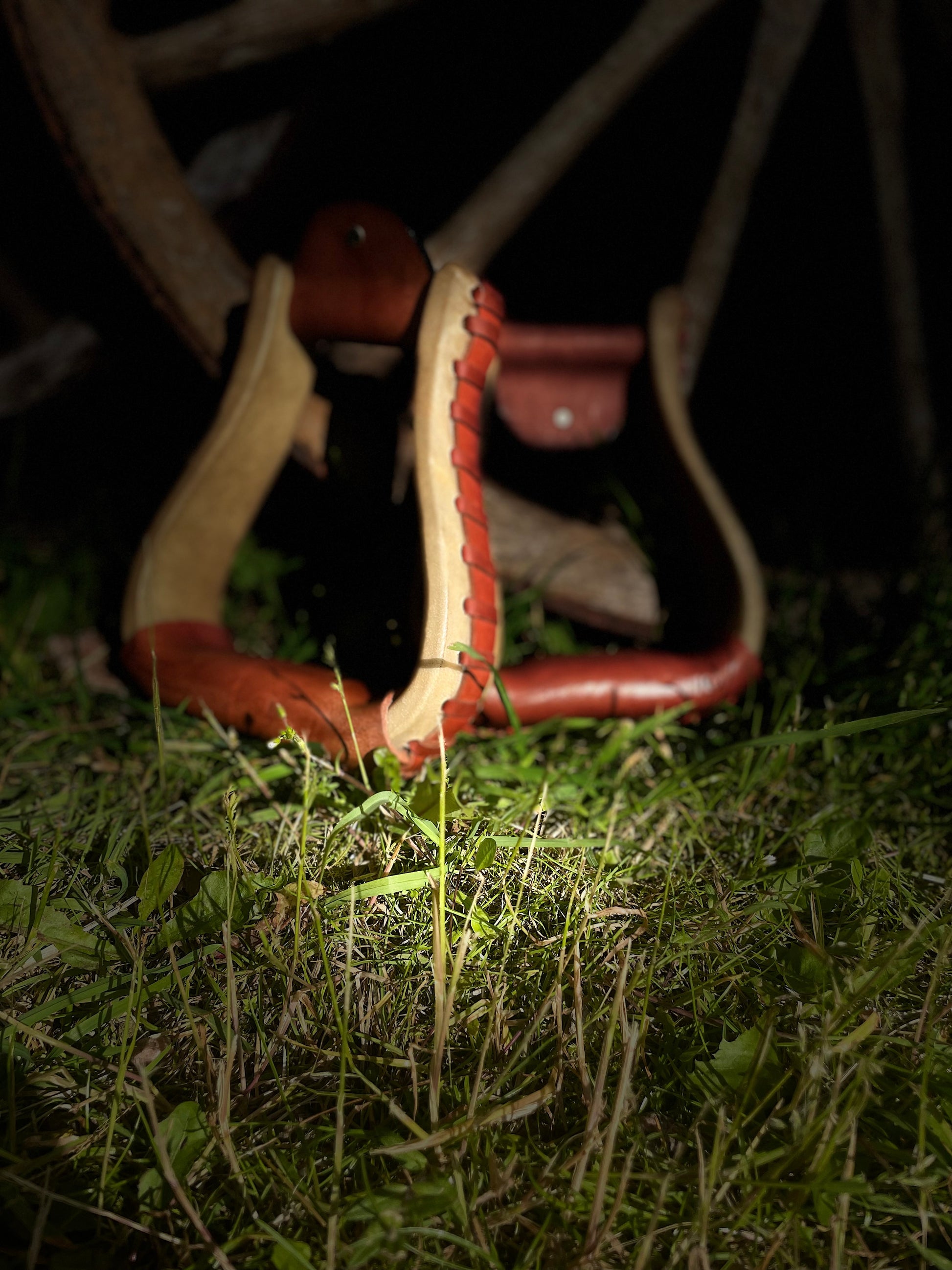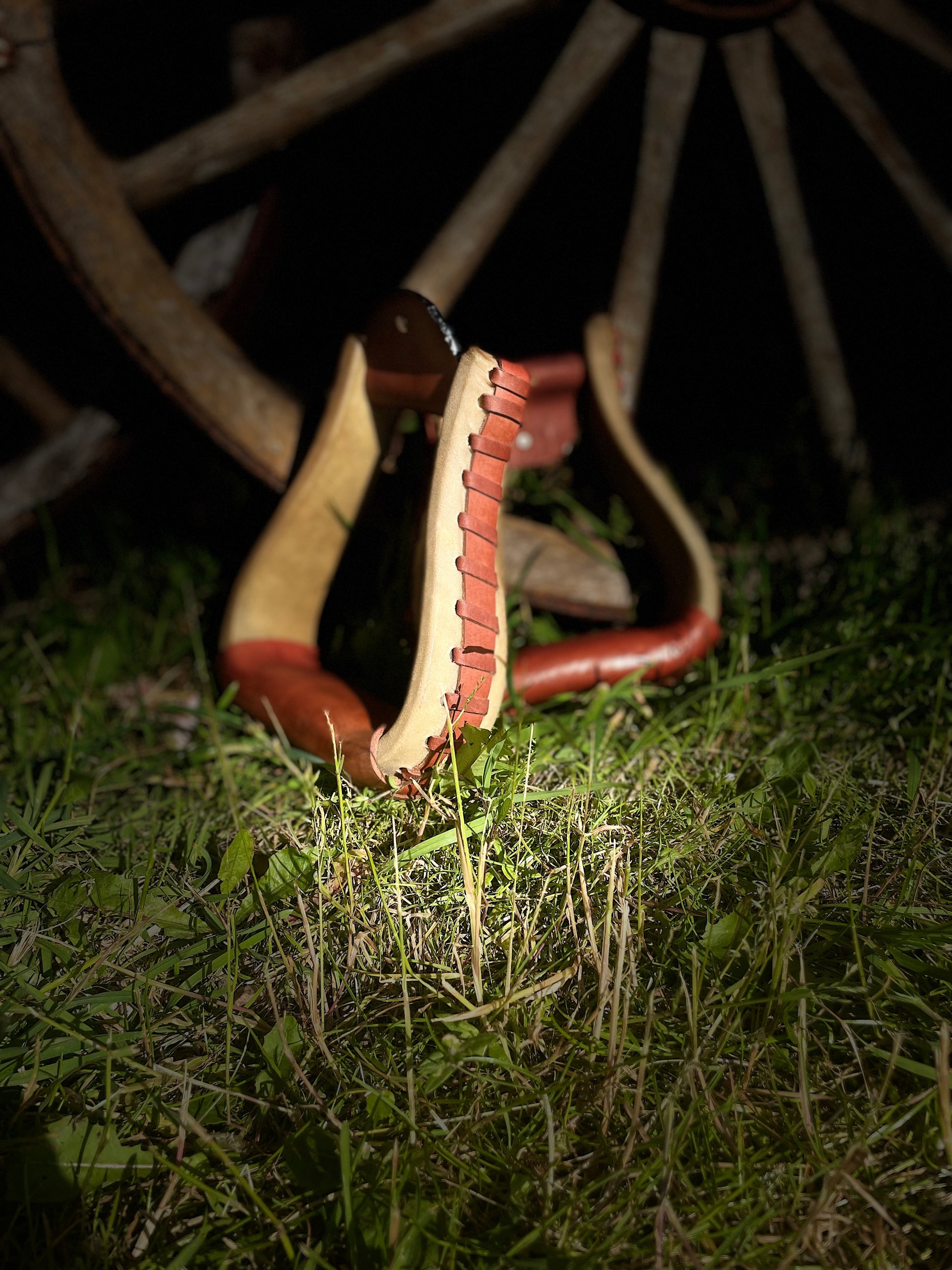 Westernsteigbügel mit Rohhaut und Lederbezug.