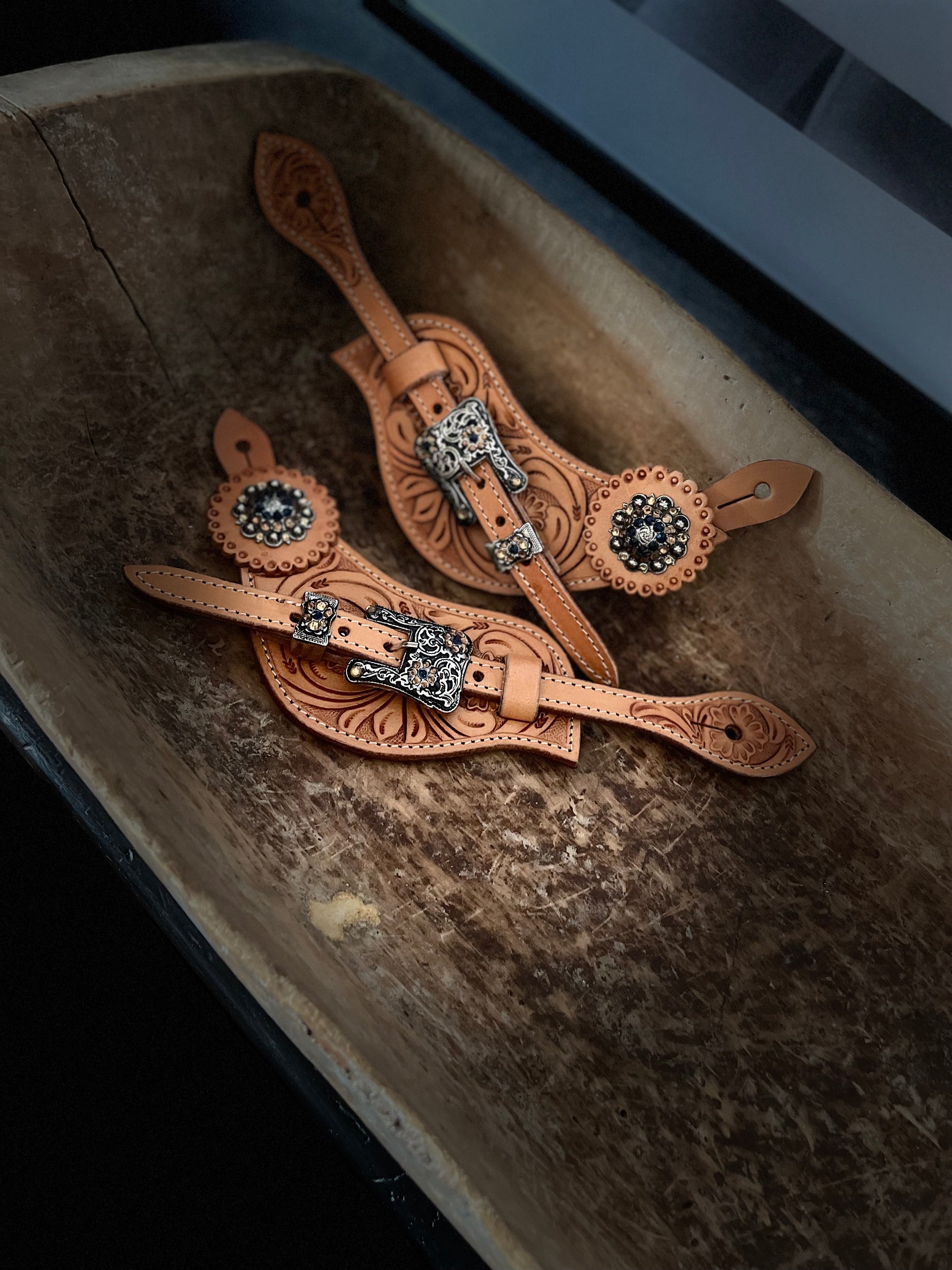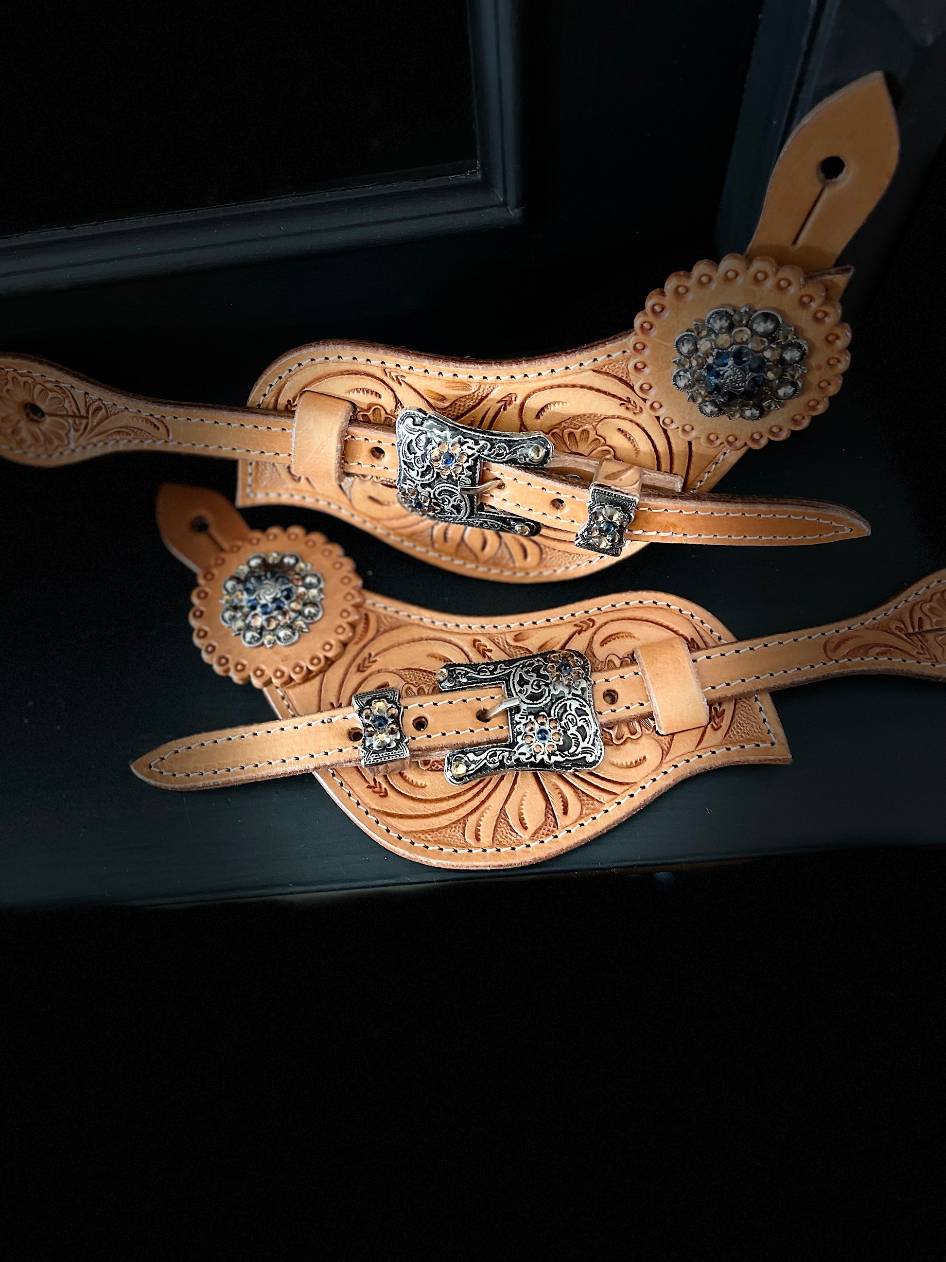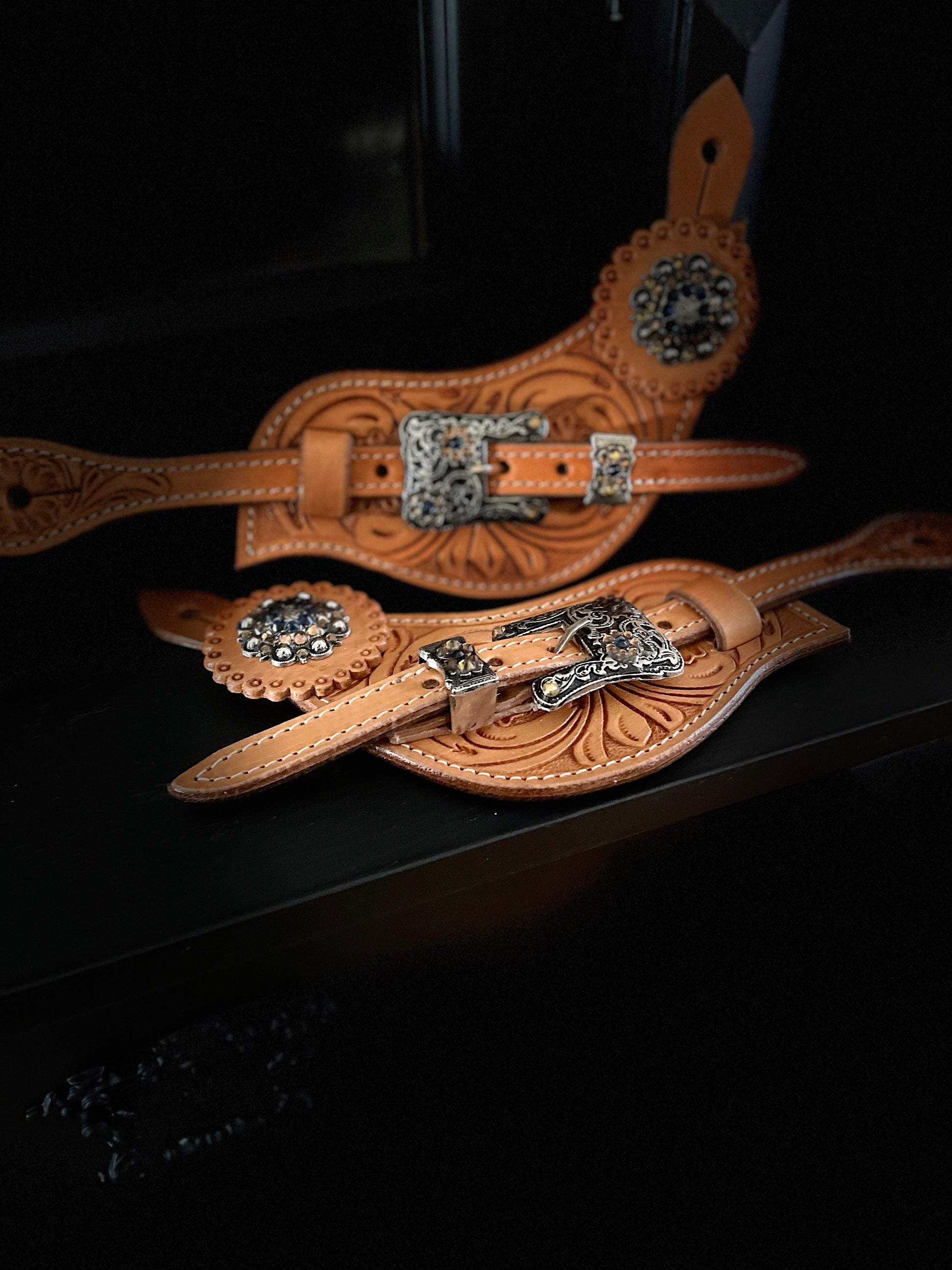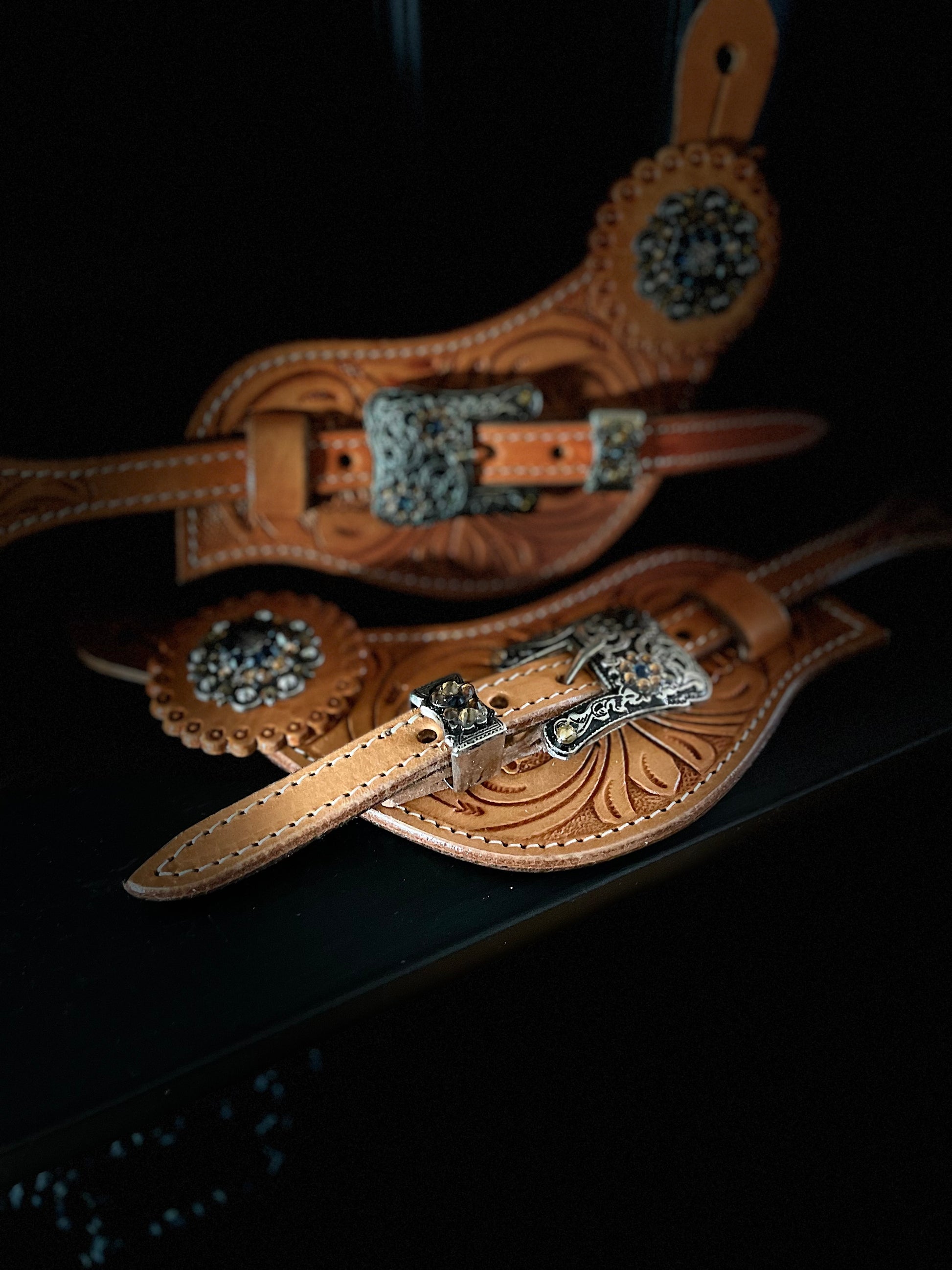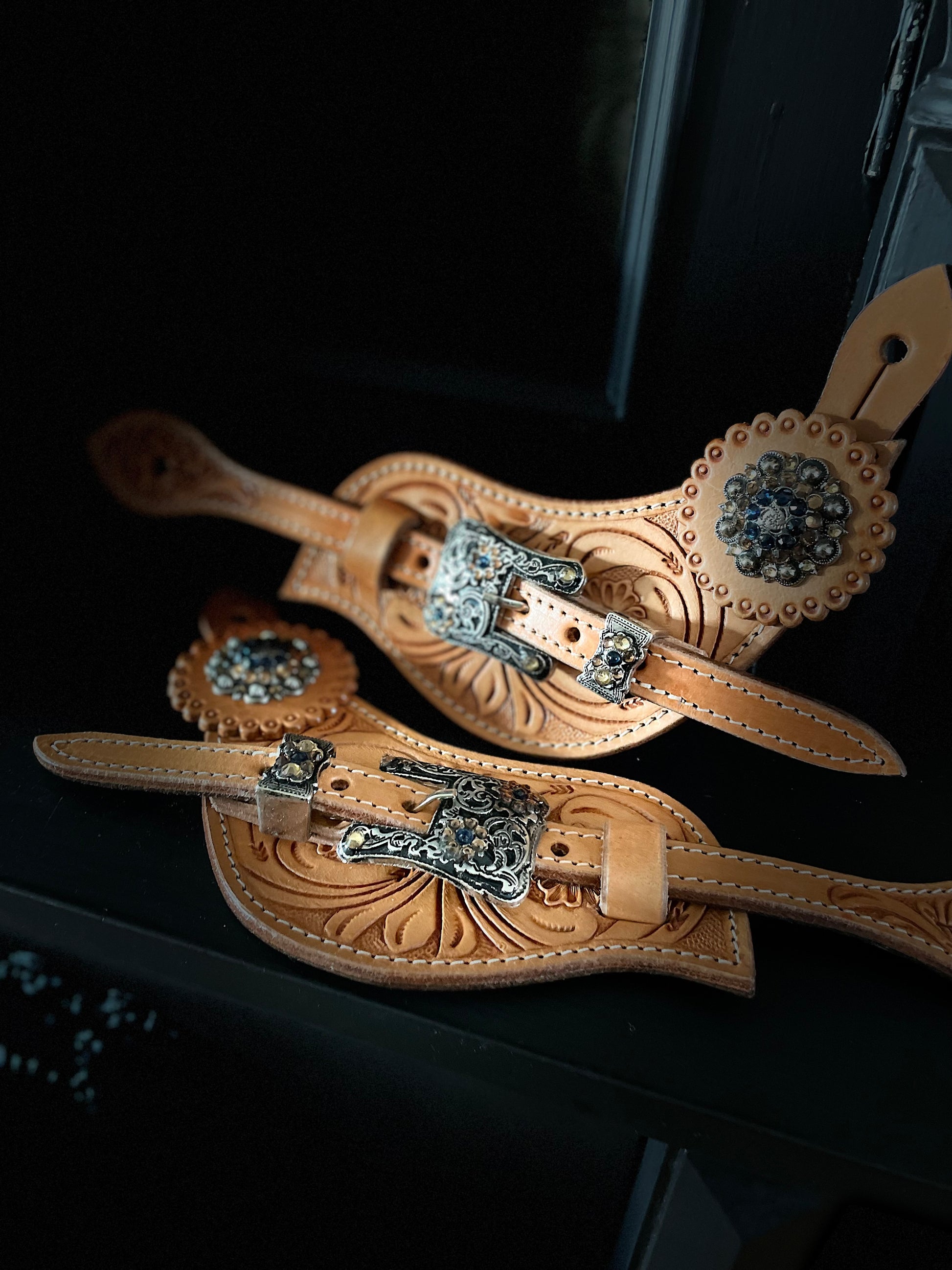läder till sporrar i konjak läder . Med stor chonchos - closer och massor av Diamond detaljer i brun svart - strass