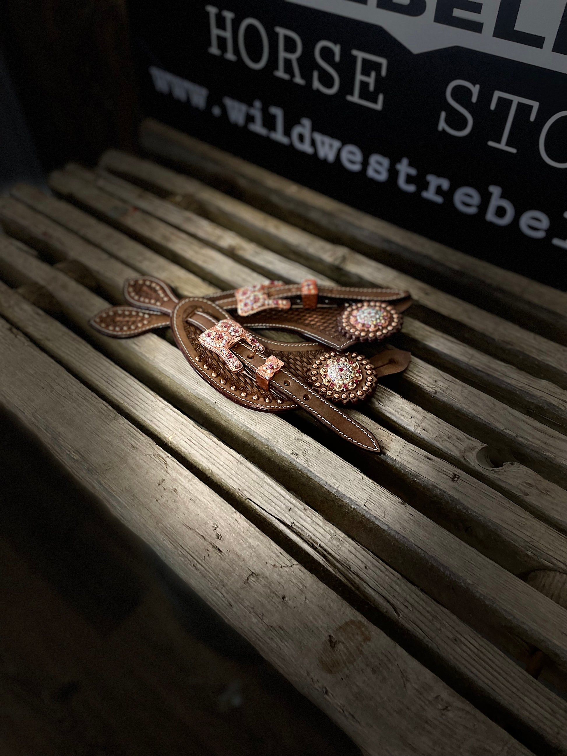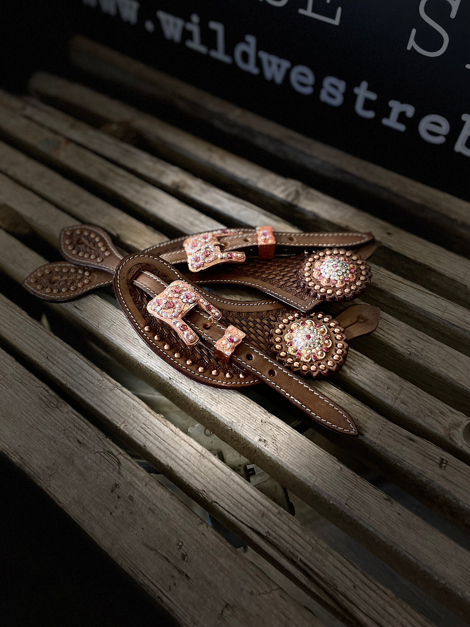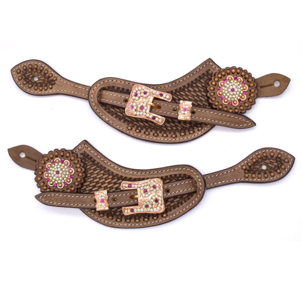 läder till sporrar i brunt läder . Med stor chonchos - closer och massor av Diamond detaljer i diamant och rosa - strass