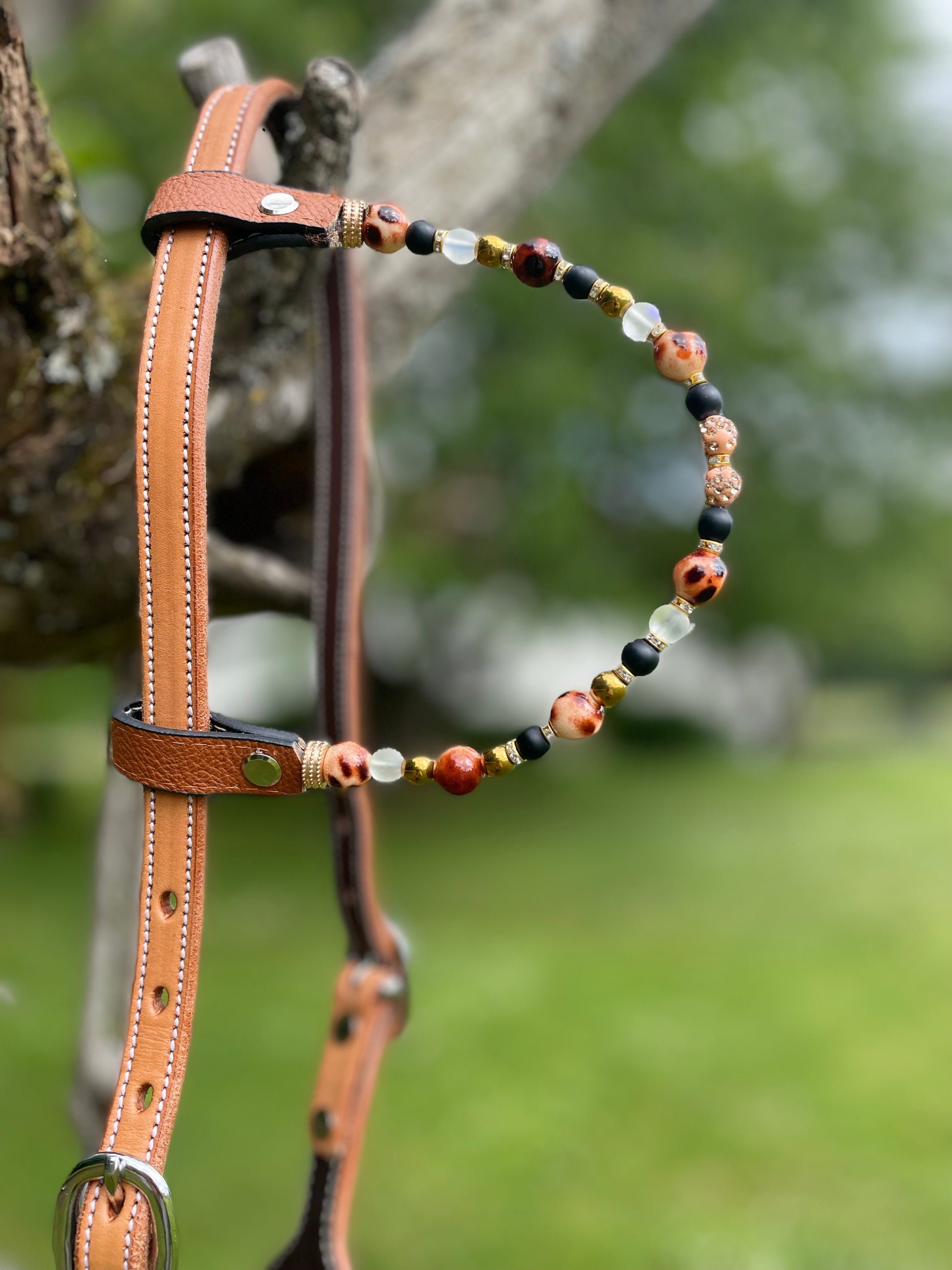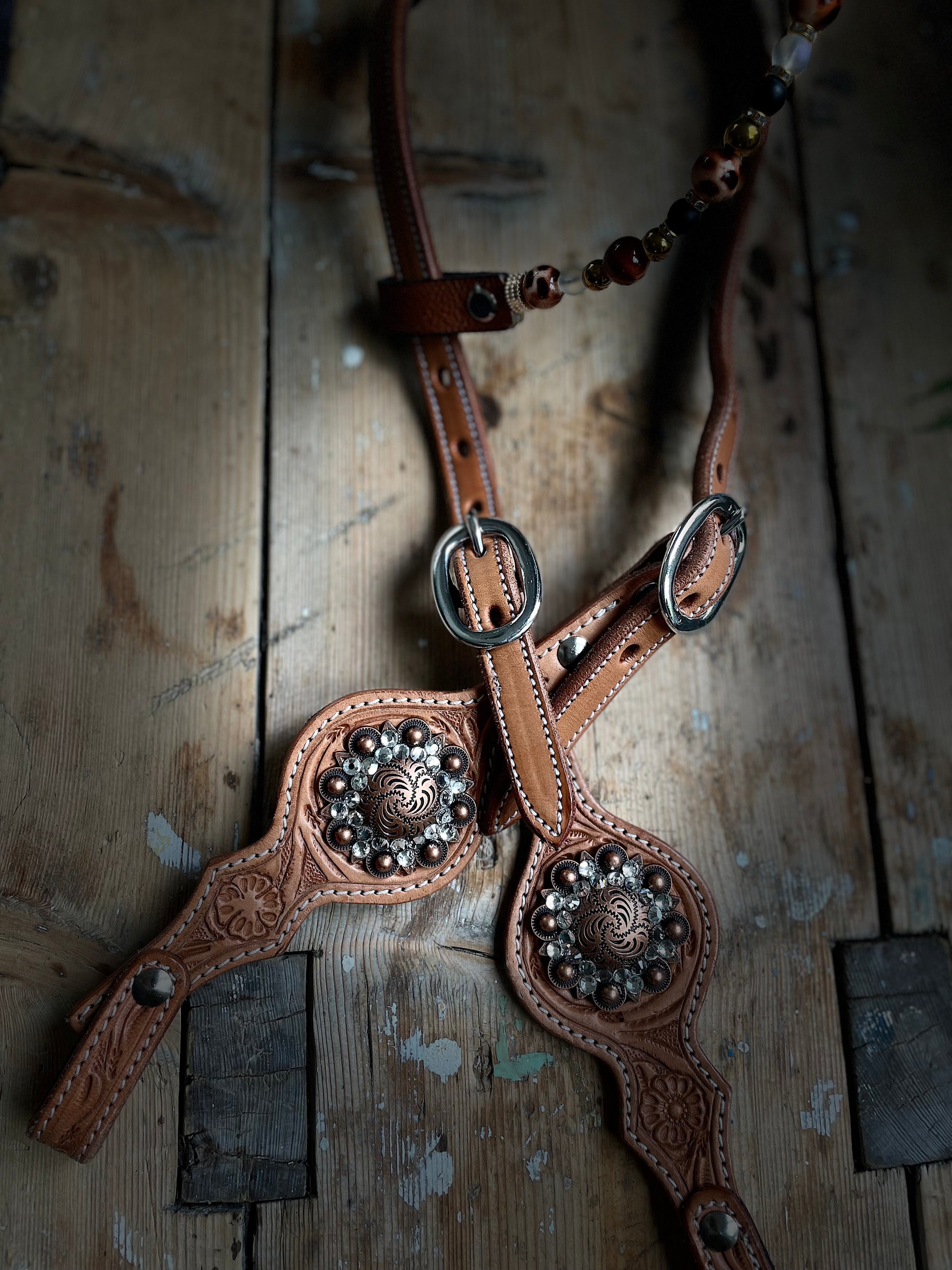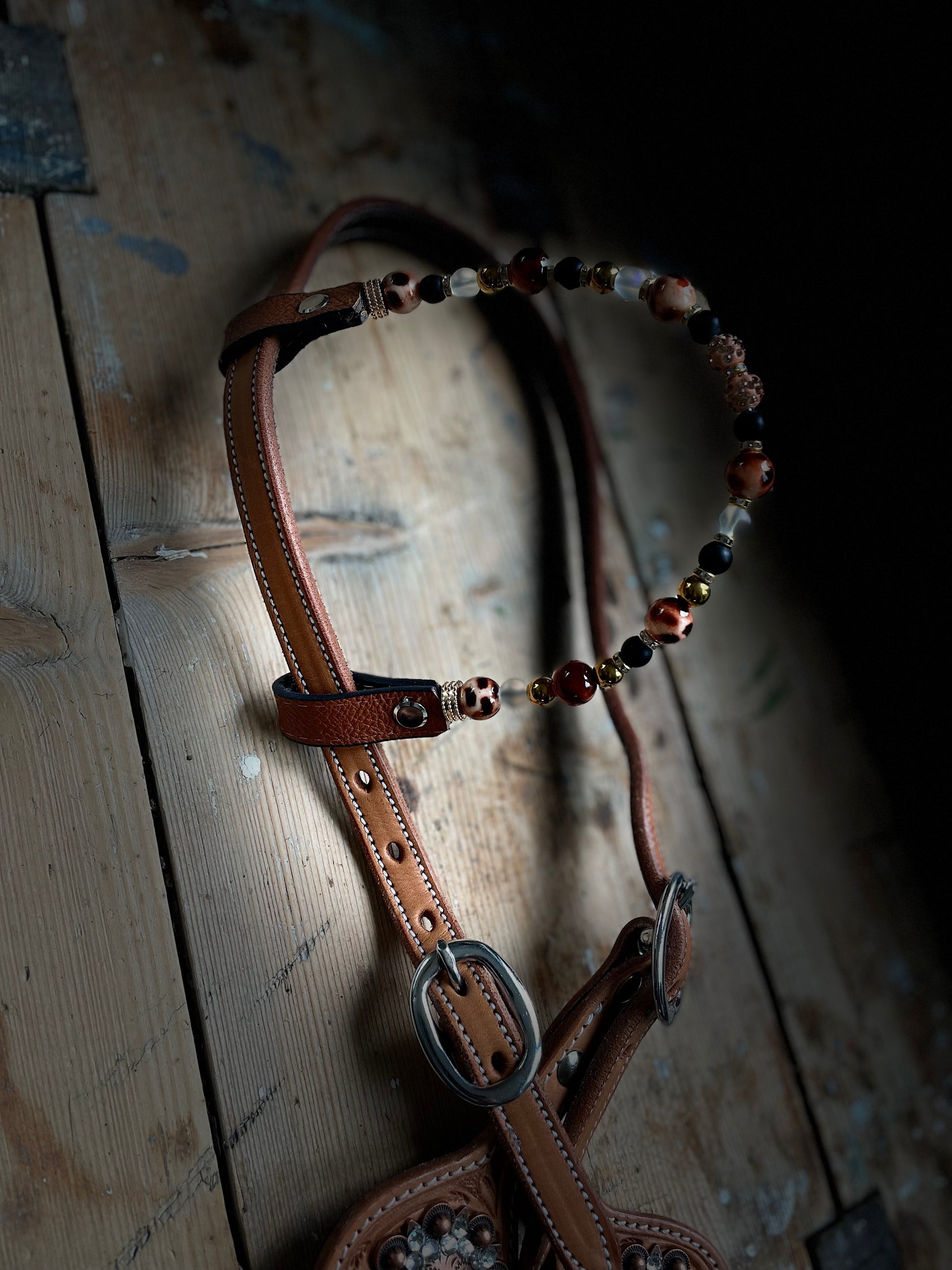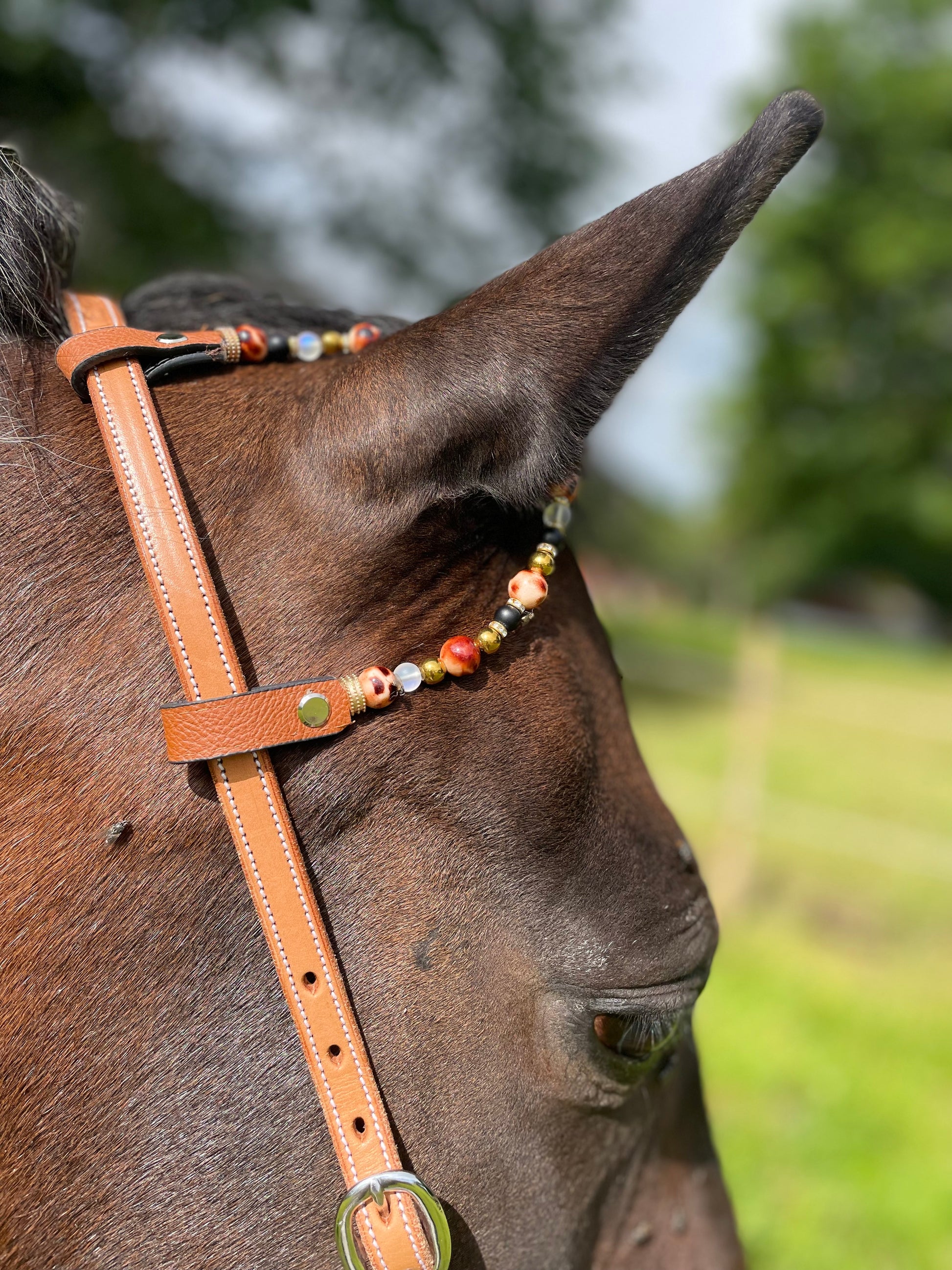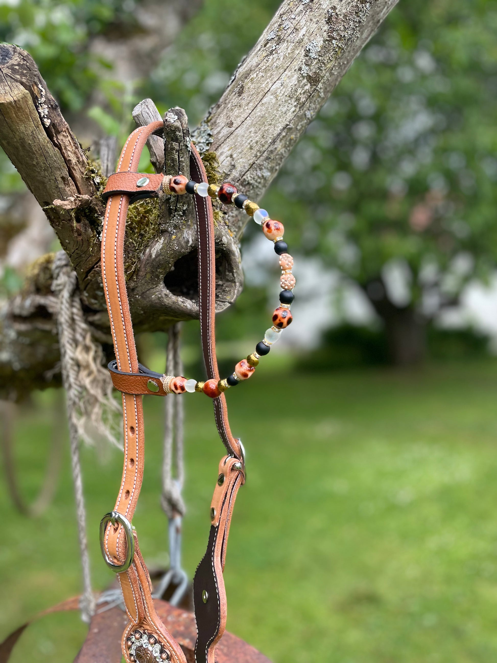 cheek . Och snygg bling chonchos med pärlor och coppar. Läder i bruna toner