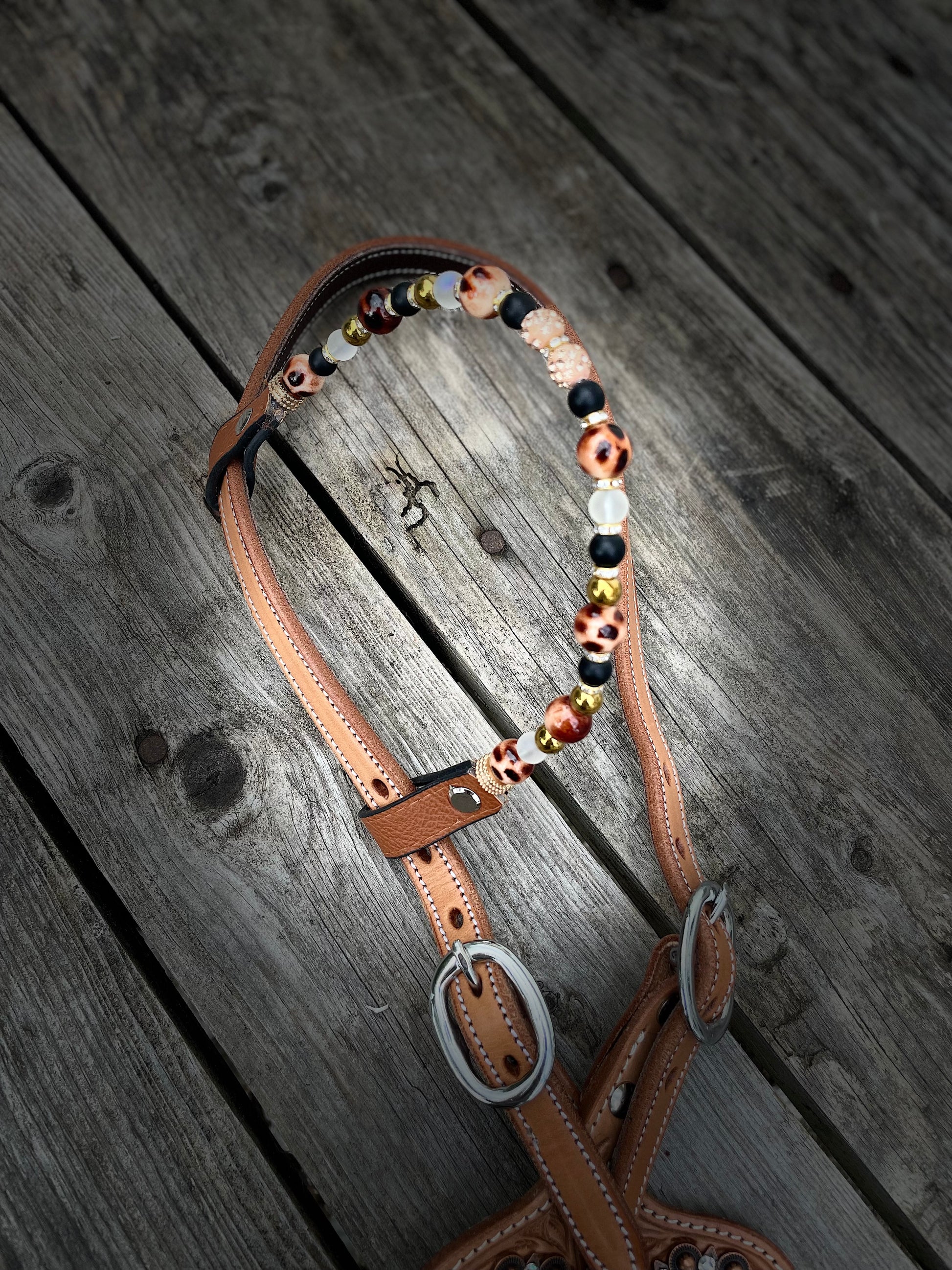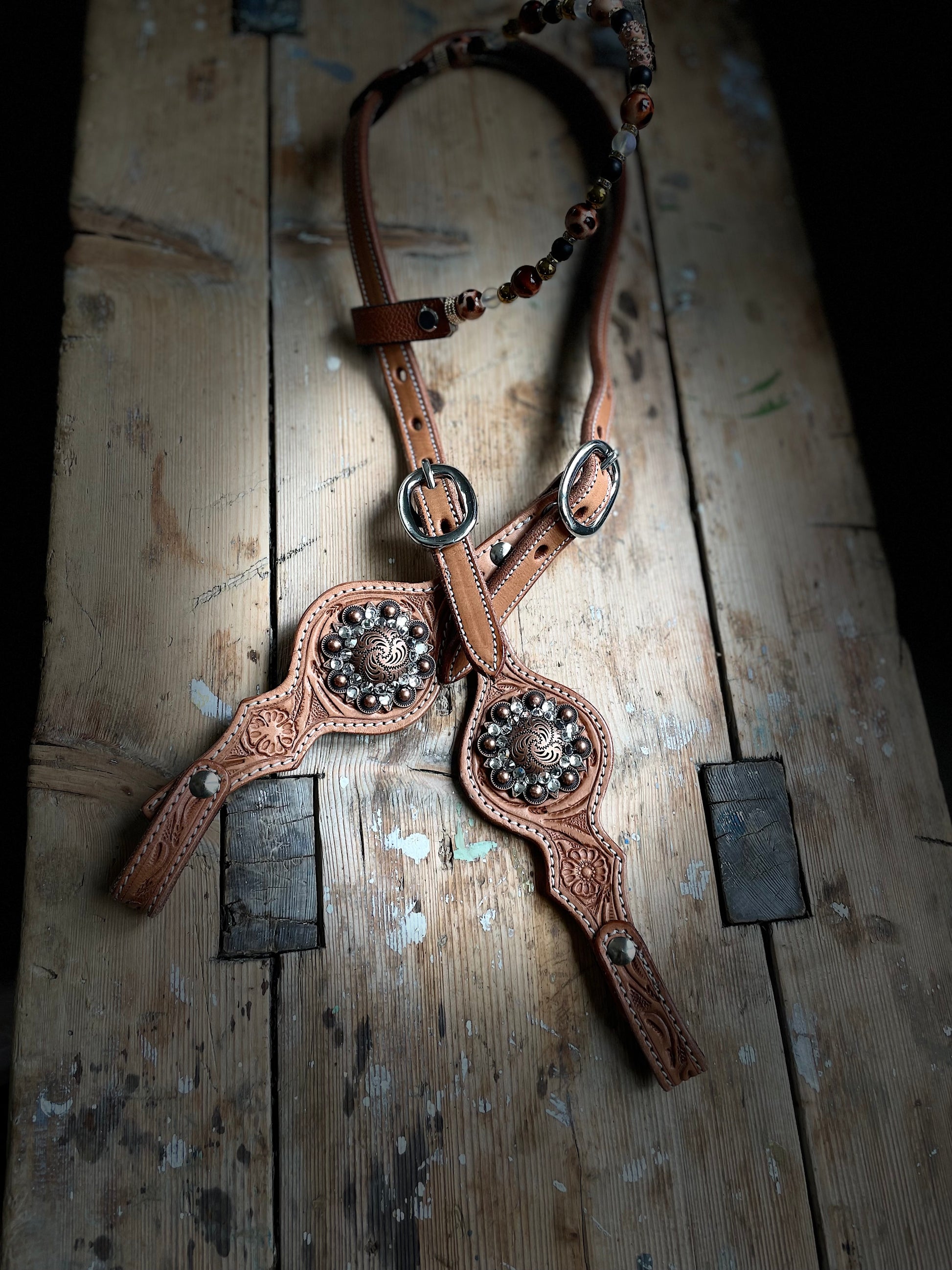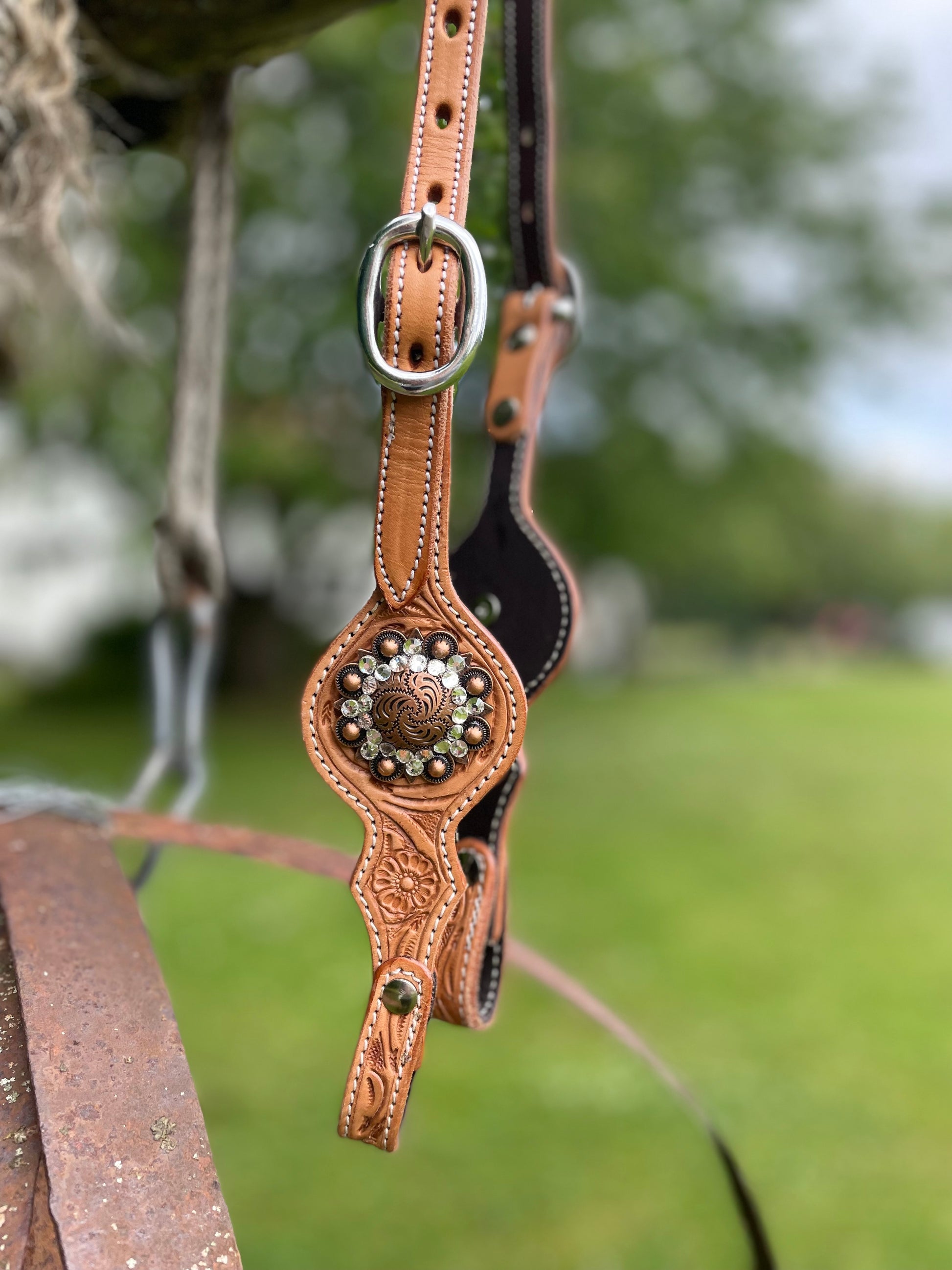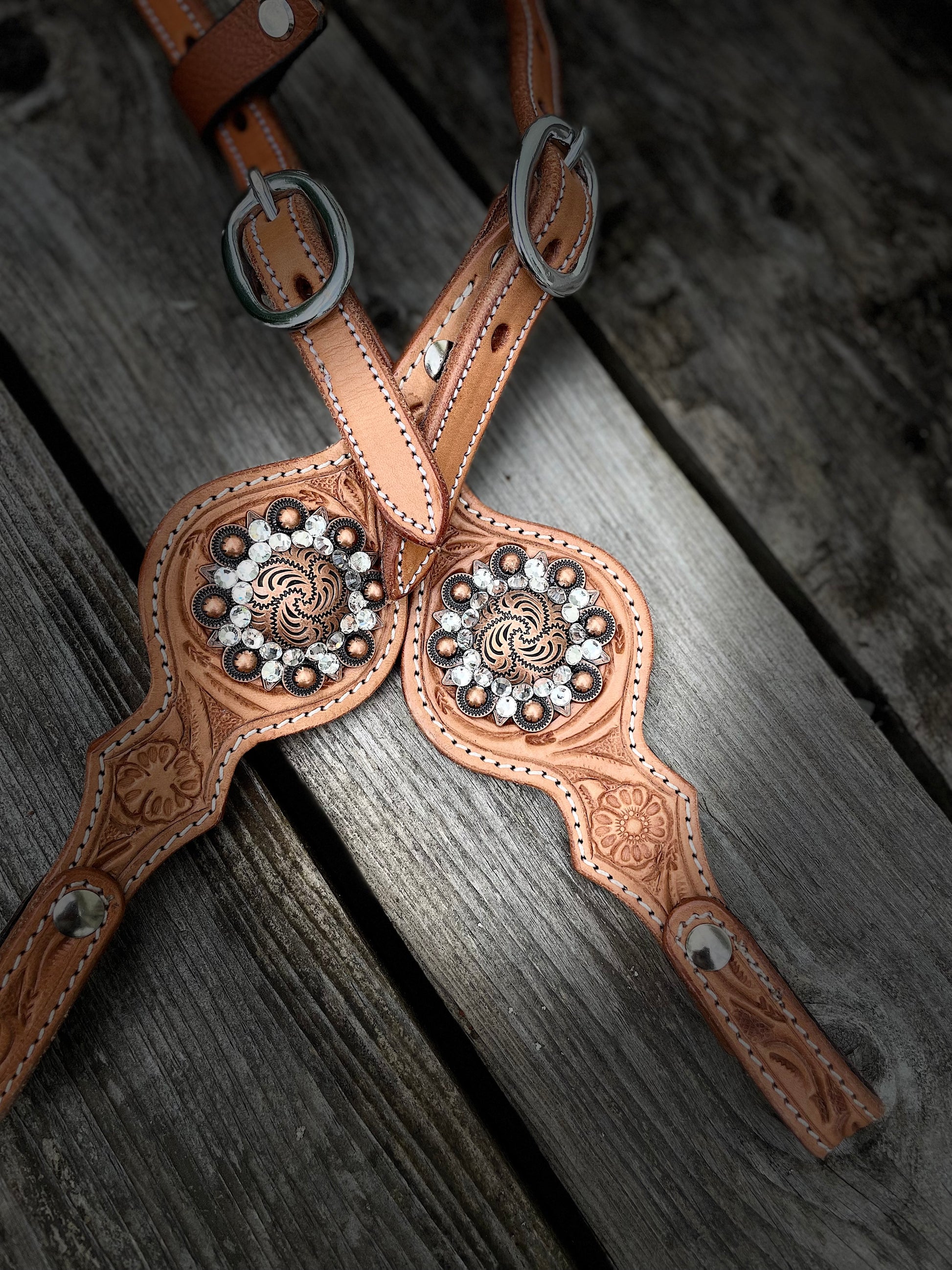 cheek . Och snygg bling chonchos med pärlor och coppar. Läder i bruna toner