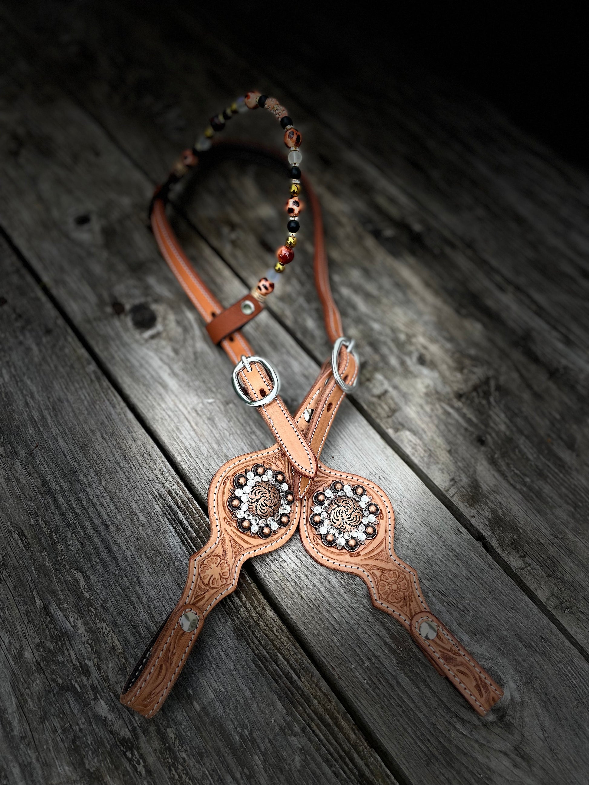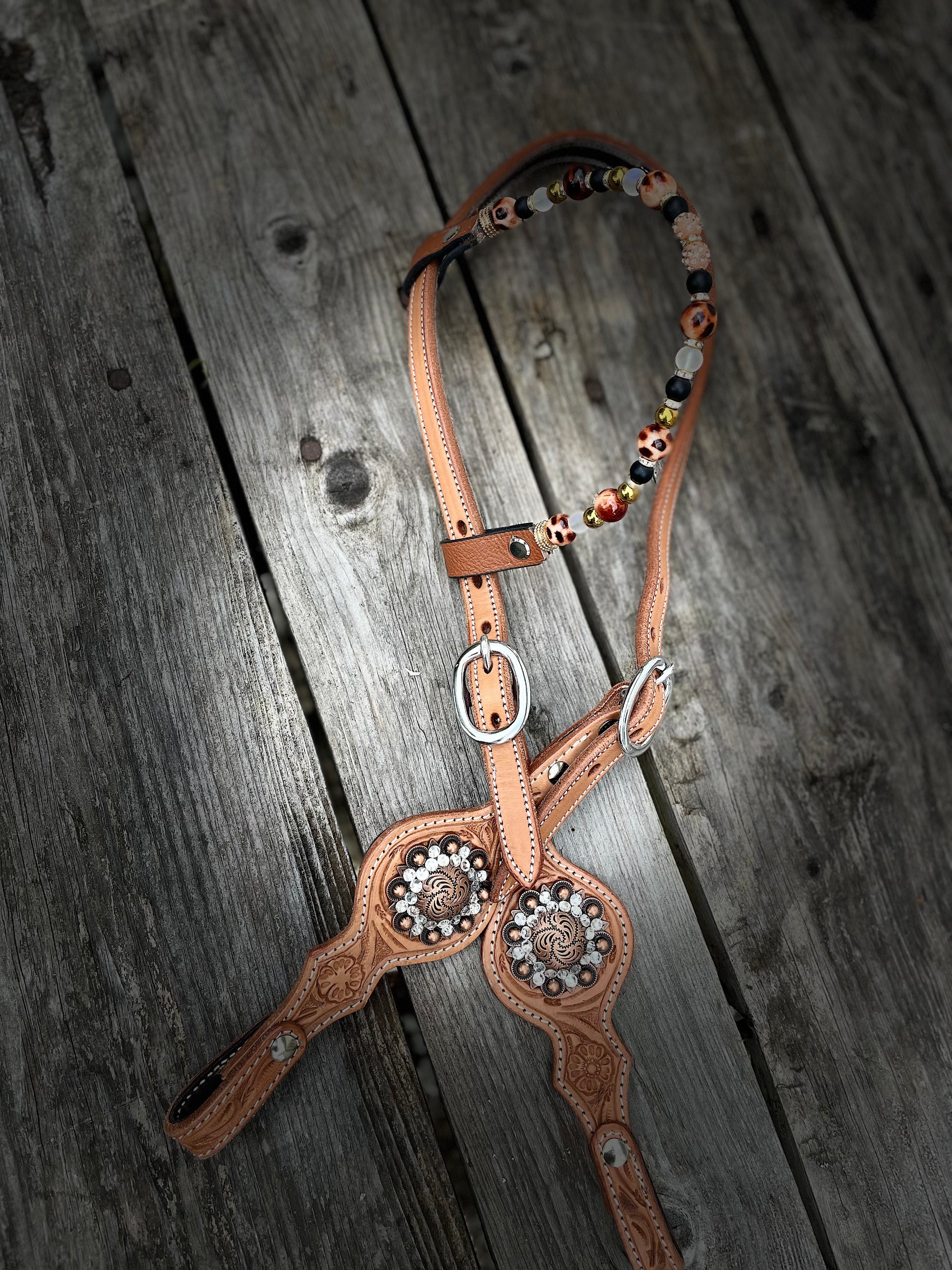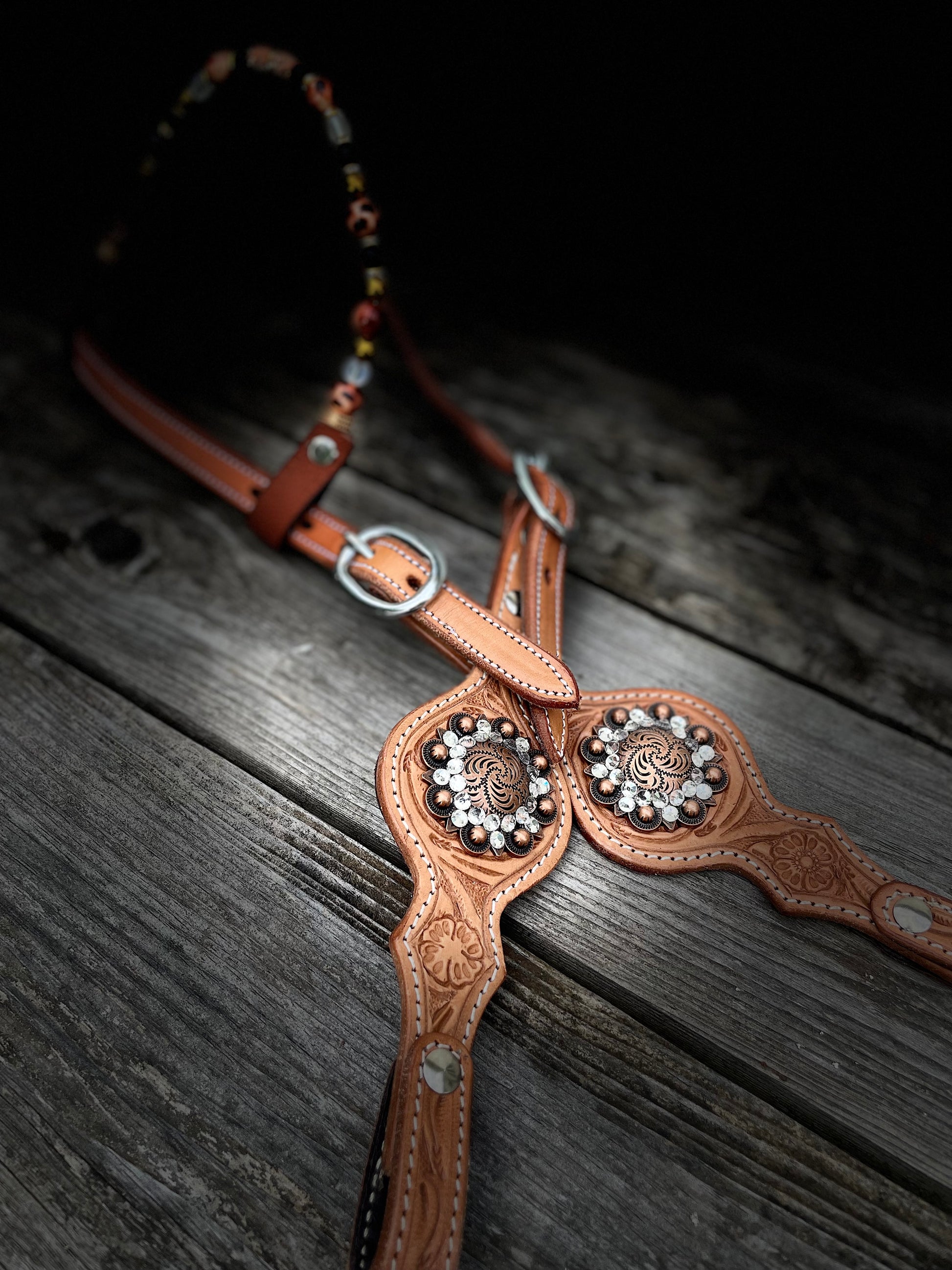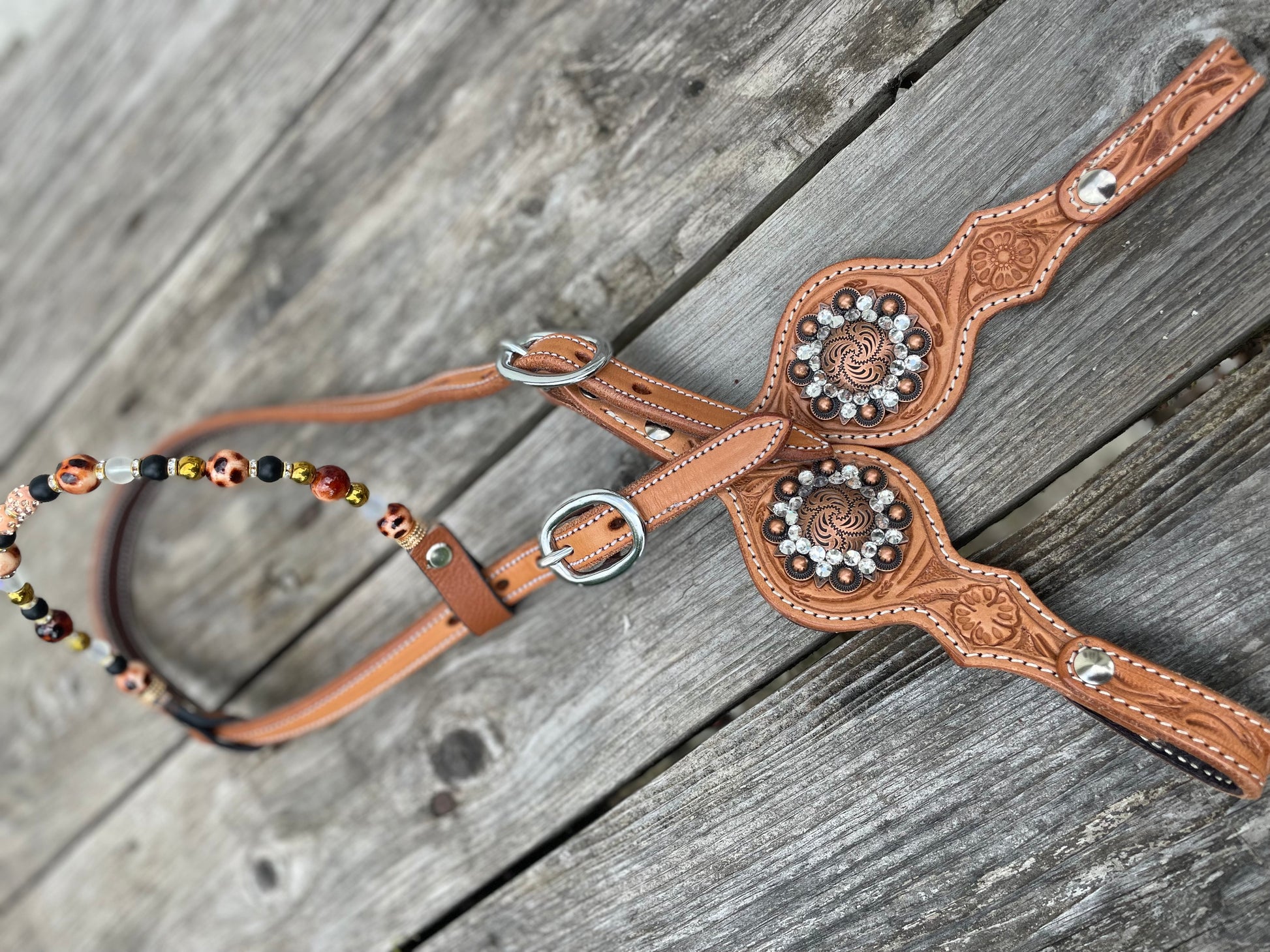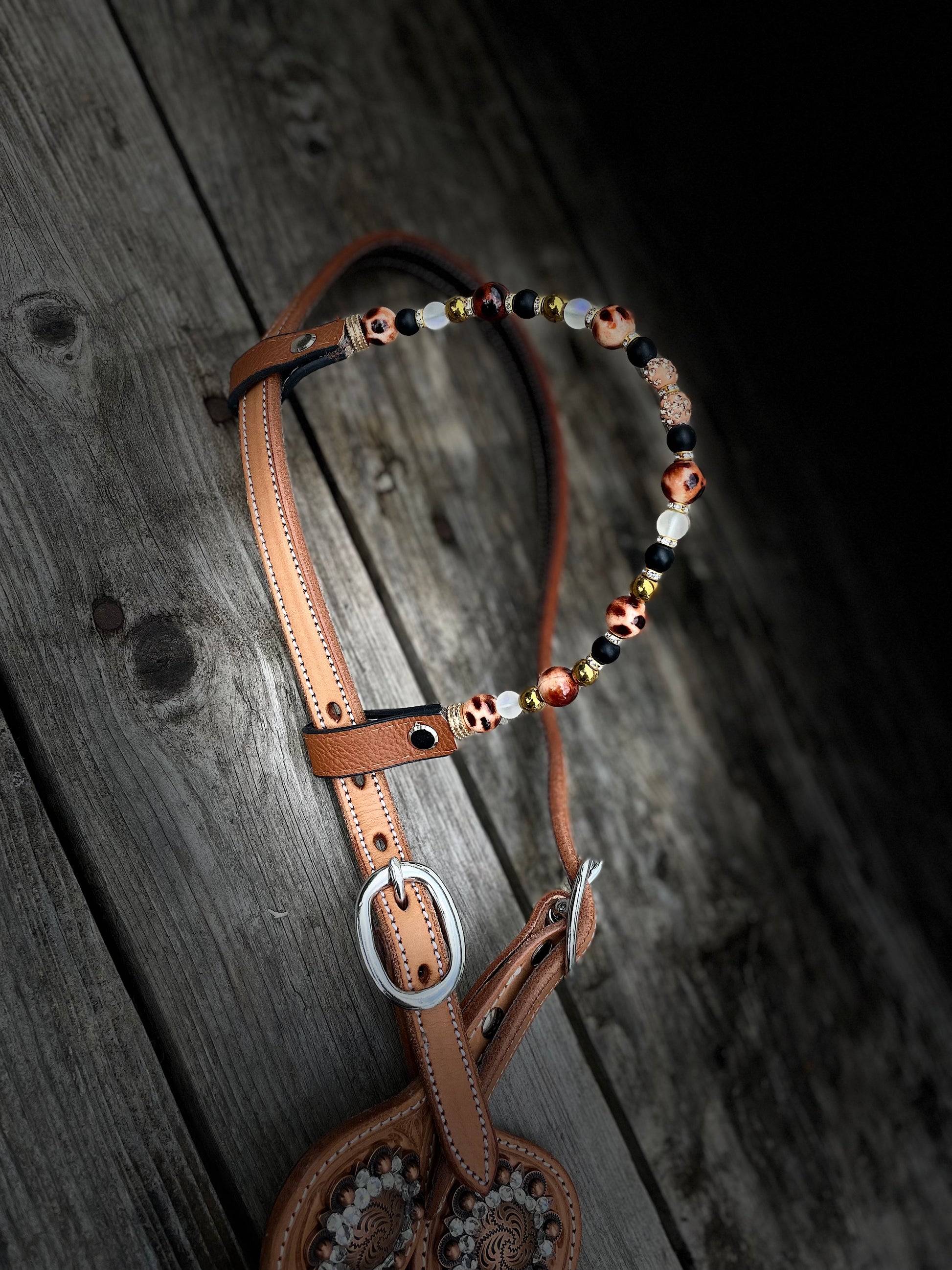 cheek . Och snygg bling chonchos med pärlor och coppar. Läder i bruna toner